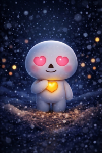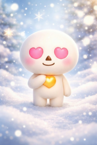 ふわっと舞う雪の中で、胸のハートが優しく光る HEARTON(ハートン)。