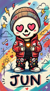 ポップな落書き風の背景に、ストリート感のあるハートスカルが映える一枚。