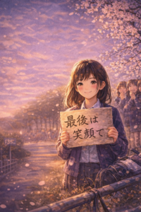 夕焼け色の空と舞う花びらの中、やさしい笑顔の女の子が掲げる言葉は「最後は笑顔で」。