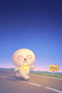 星が広がる夜のコースを、胸のハートを灯しながらマラソン中のハートン。