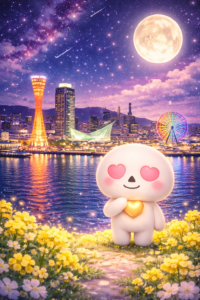 神戸の港の夜景に、満月と星空がきらめく幻想的な空。
