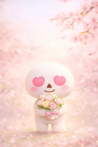淡い桜の空気に包まれて、リボン付きの小さな花束をぎゅっと抱えるハートン。
