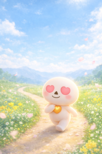 やわらかな青空の下、菜の花に包まれながら胸のハートをそっと灯すハートン。