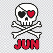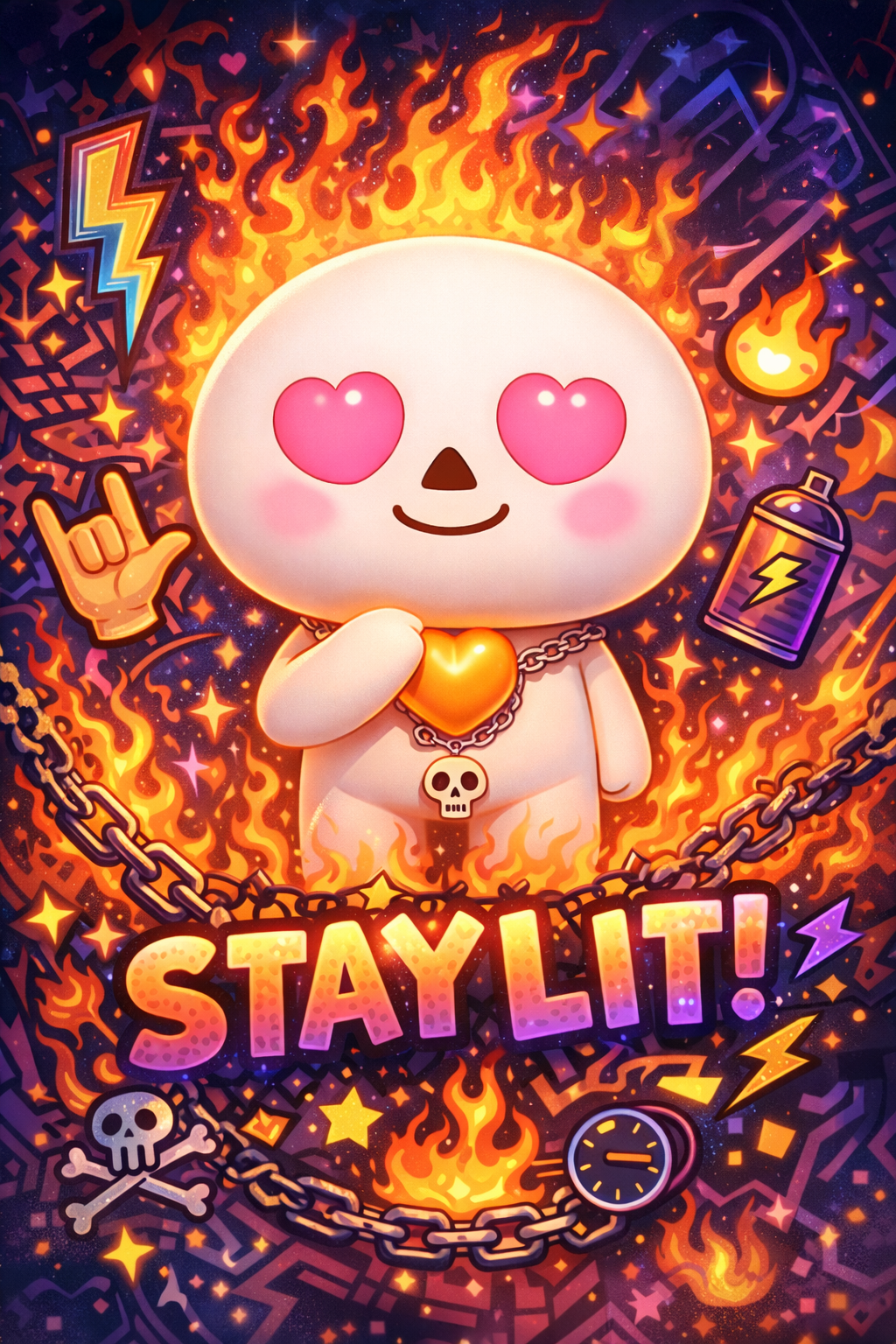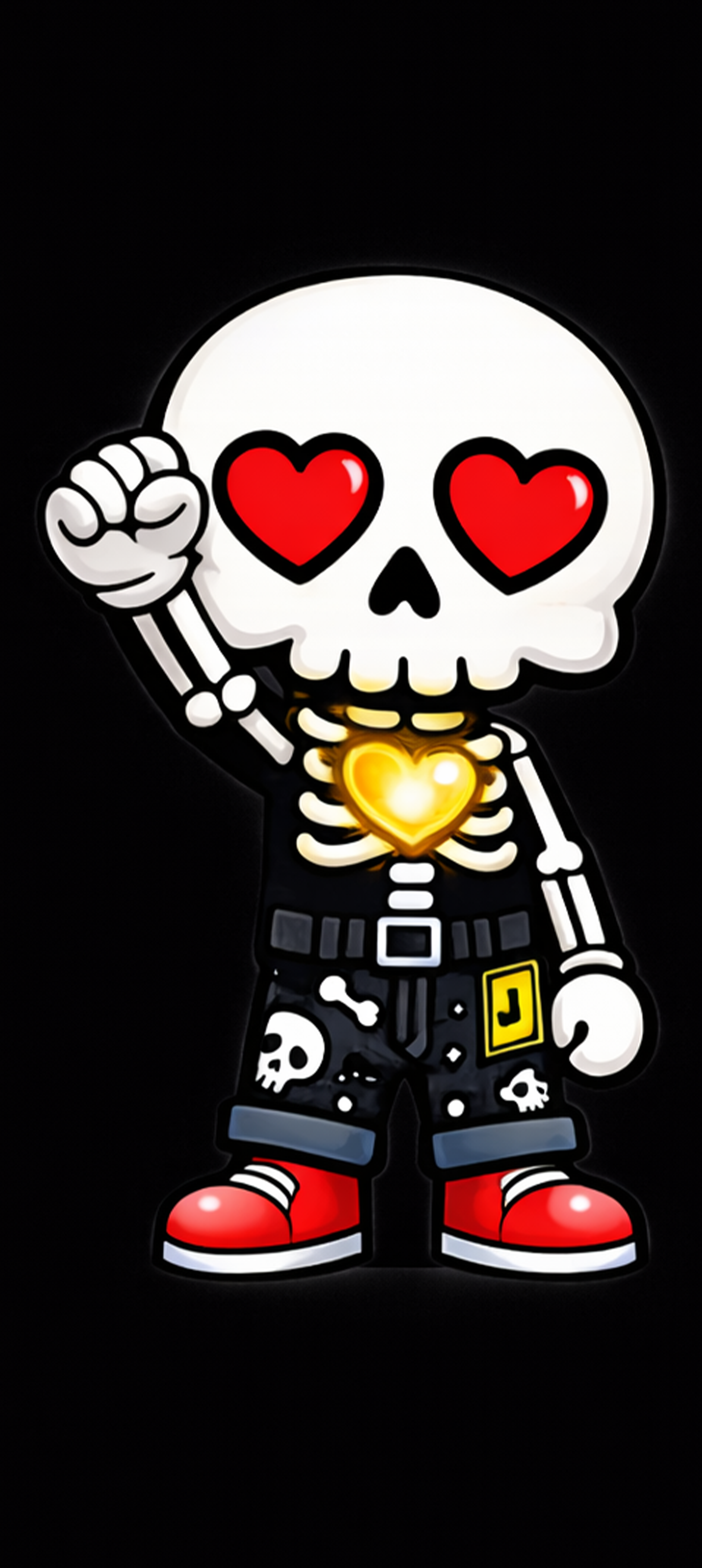 ポップな落書き風の背景に、ストリート感のあるハートスカルが映える一枚。