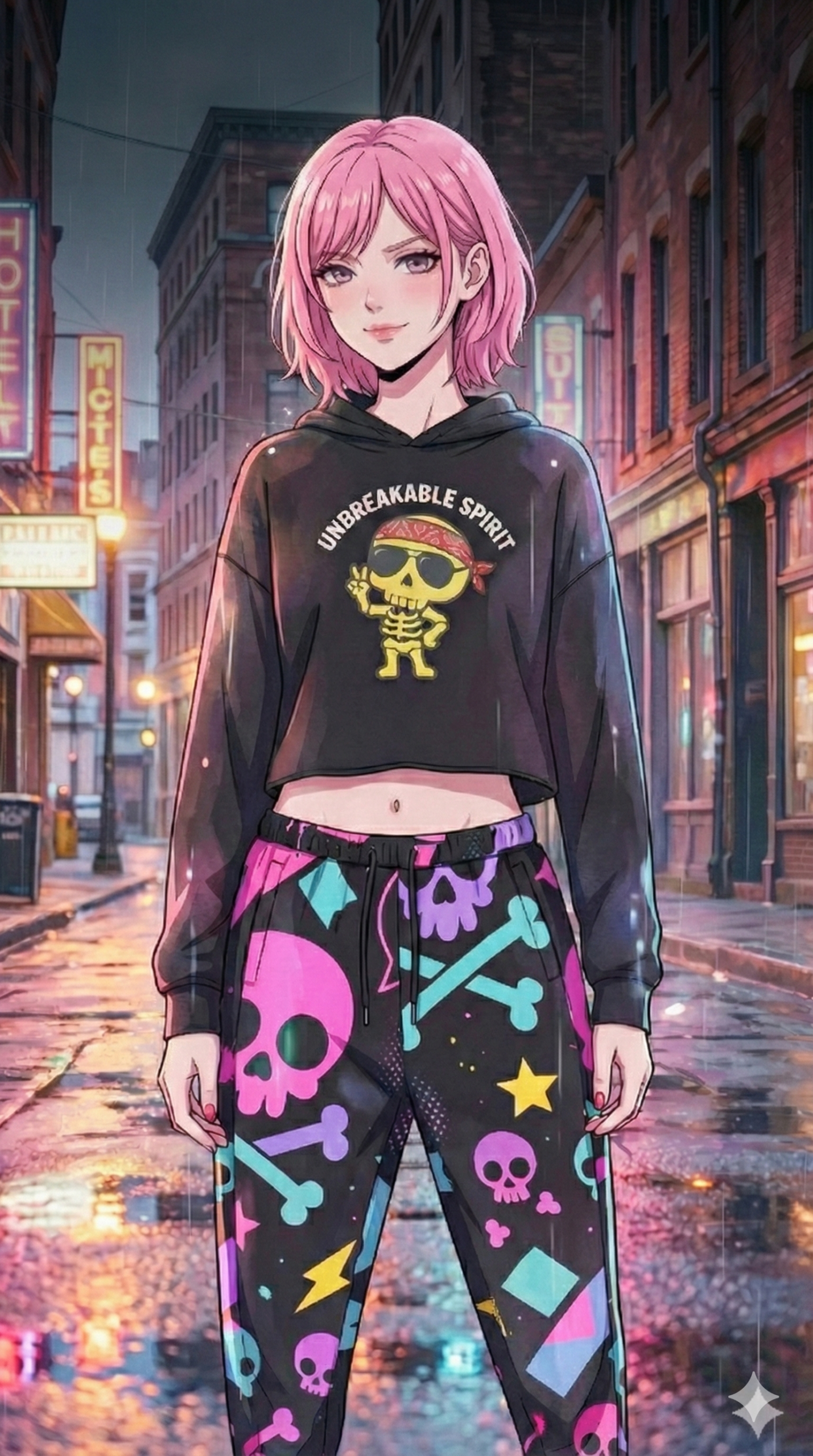 ピンクヘアの女の子と、カラフルなスカルパンツ。