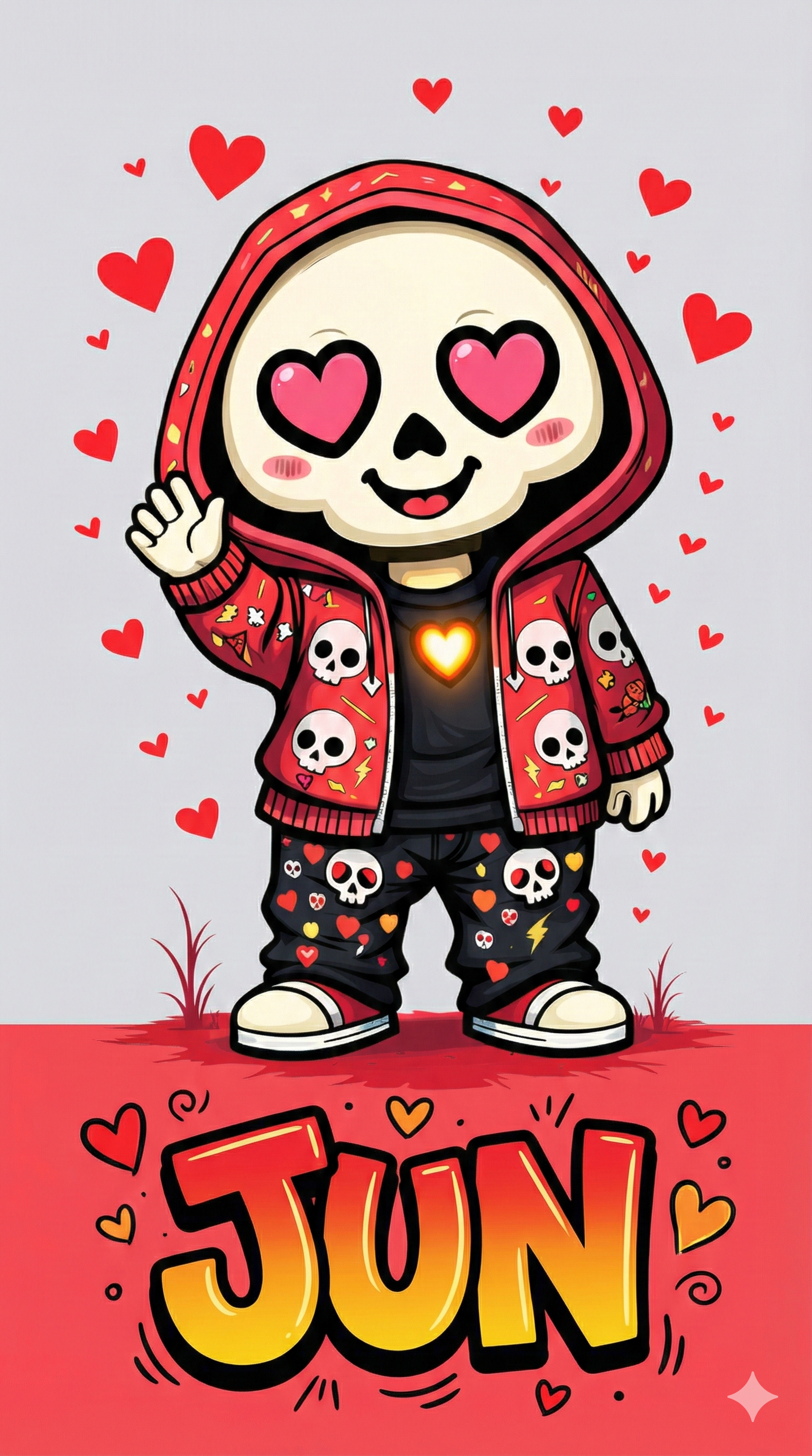 真っ赤なハートが舞う中で、フードのハートスカルがにっこり手を振る“愛たっぷり”の一枚です。