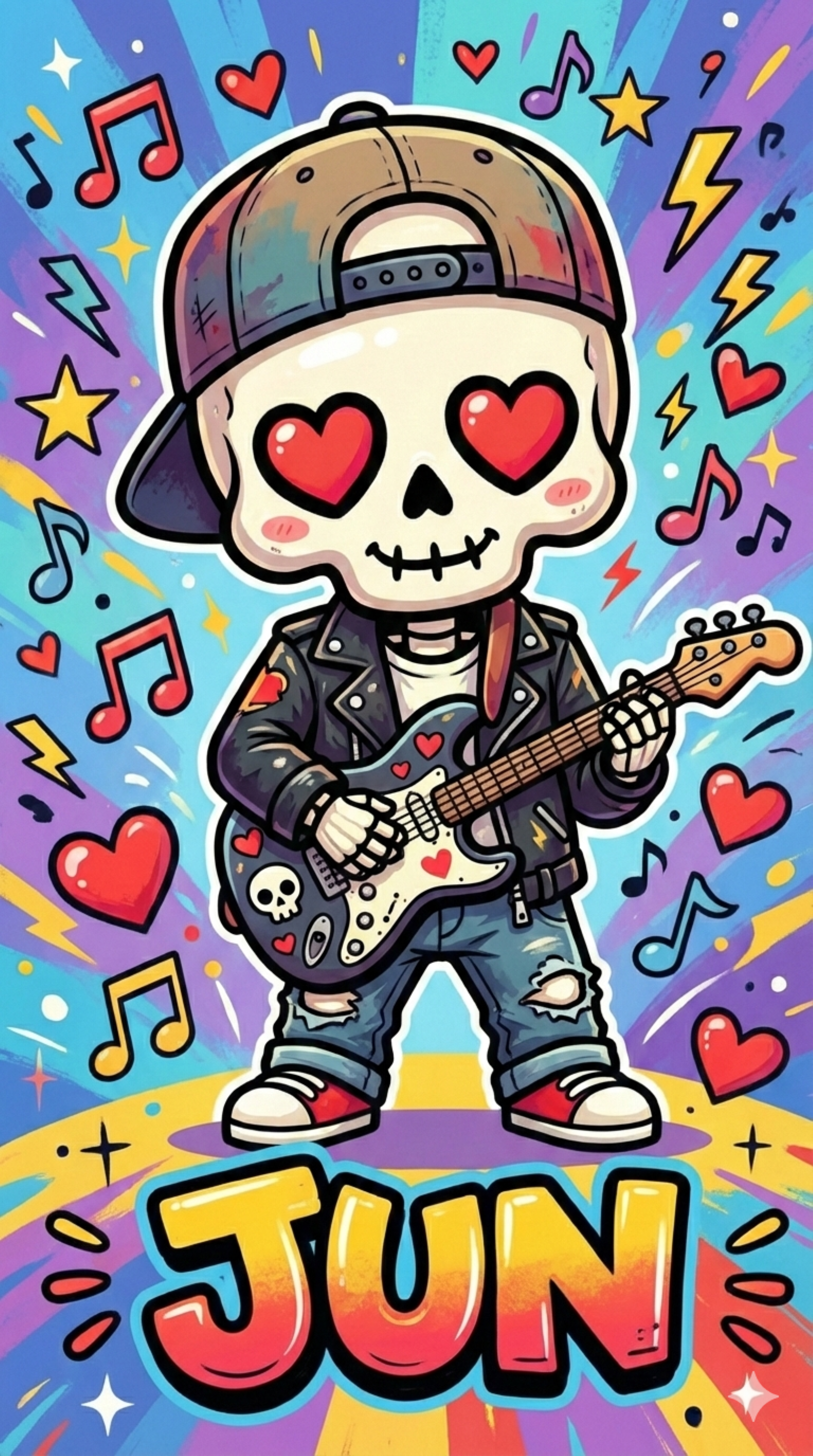 ギターを抱えたハートスカルに、音符や稲妻が弾ける“音楽全開”の一枚。
