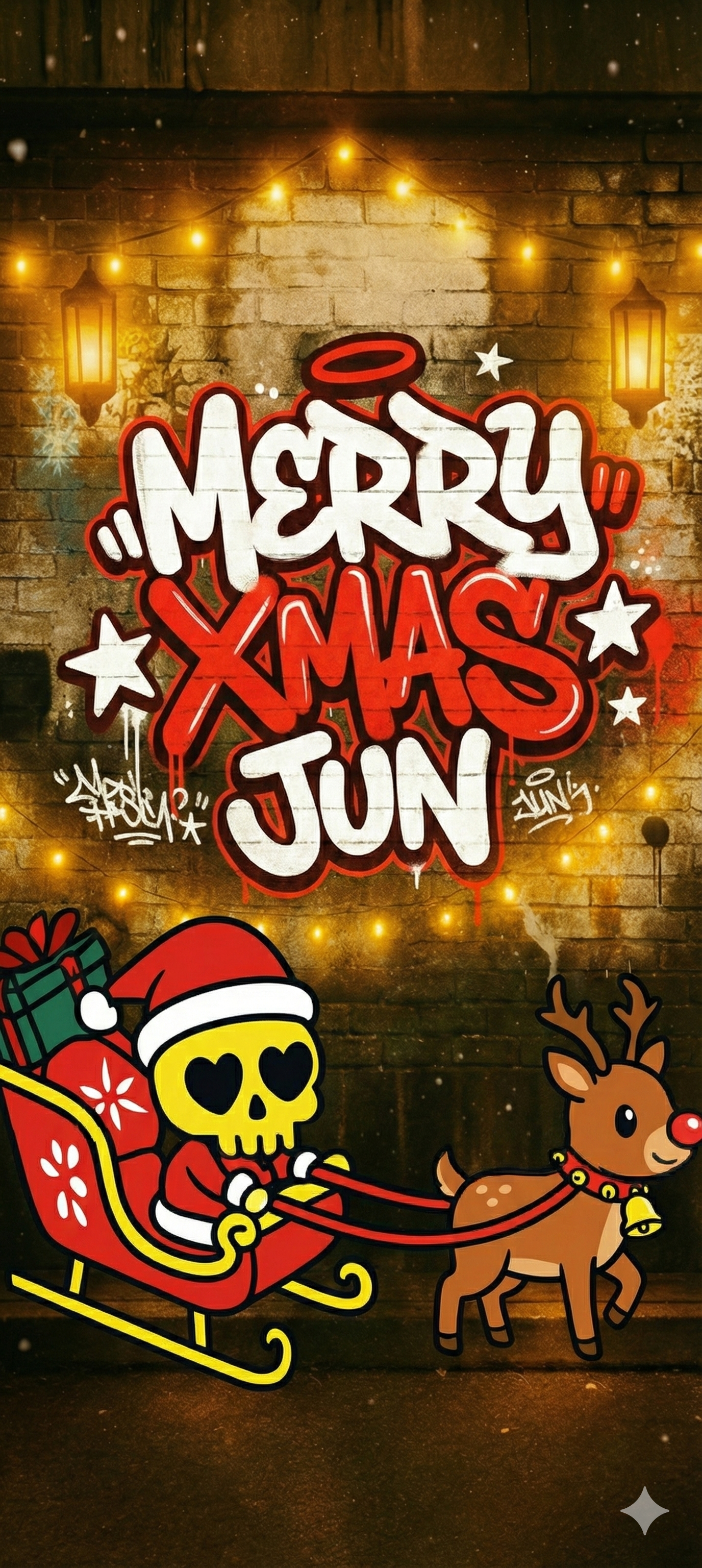 街灯の光がにじむ夜に、**“MERRY XMAS JUN”**のグラフィティが映えるストリートな1枚(A)。