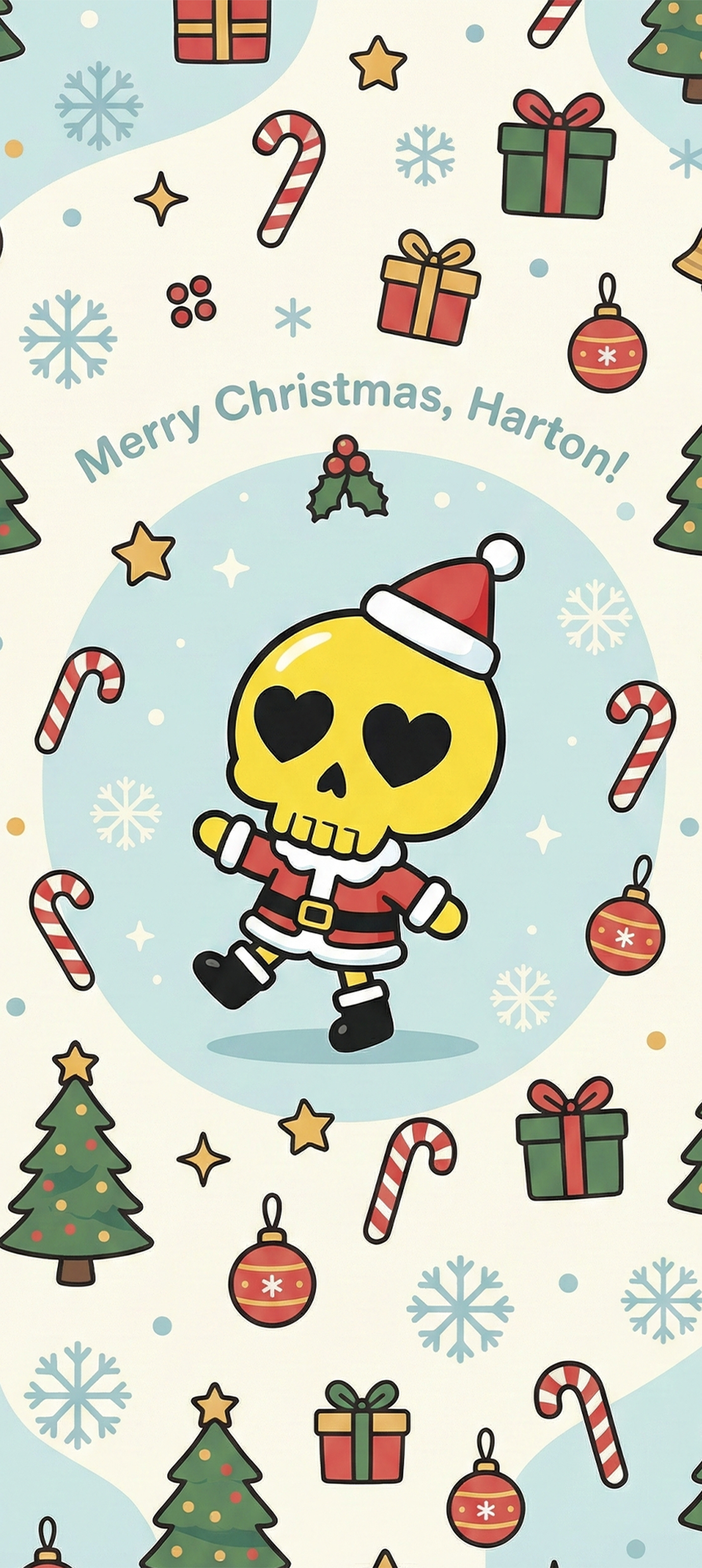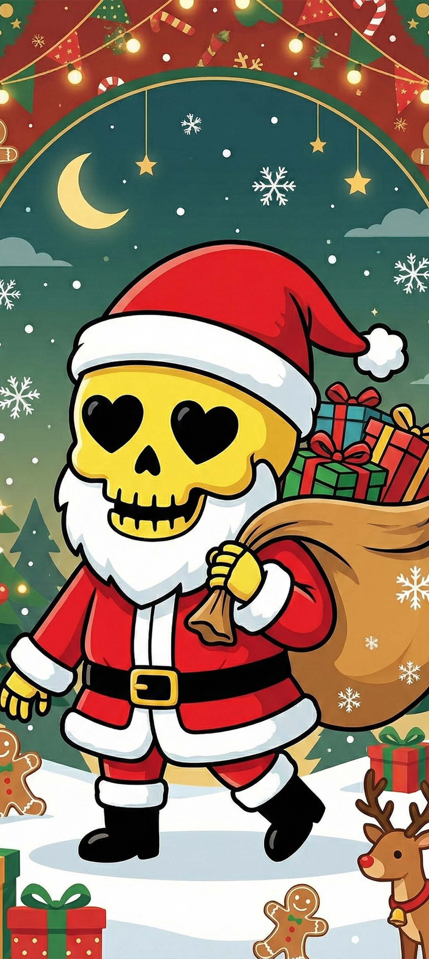 冬のモチーフに囲まれた、ハートスカルの“サンタ”が踊るポップな壁紙(A)。